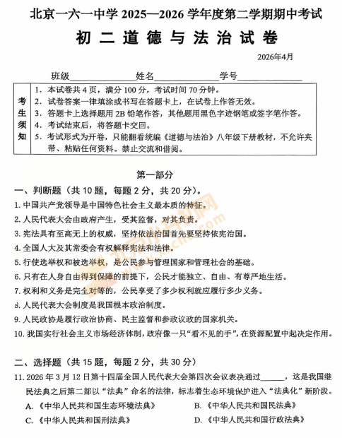 2025-2026学年(下)北京一六一中学初二期中道德与法治试卷下载!考试分值、题型有哪些?