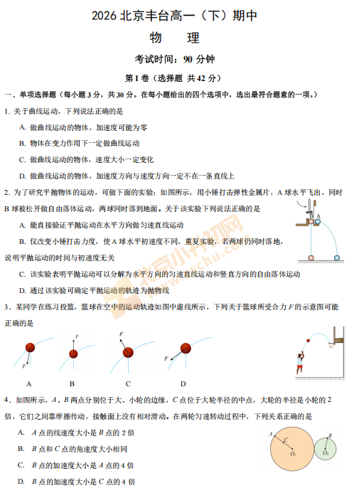 2025-2026学年(下)丰台高一期中物理试卷下载!考试分值、题型有哪些?