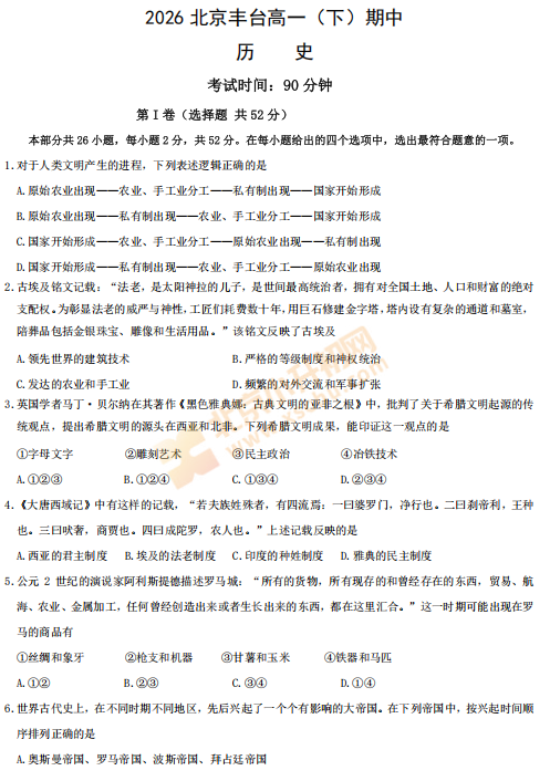 2025-2026学年第二学期丰台高一期中历史试卷
