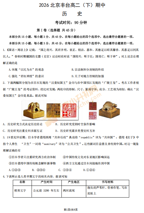 2025-2026学年(下)丰台高二期中历史试卷下载!考试分值、题型有哪些?