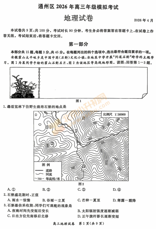 2026通州高三一模地理试卷已出!考哪些内容?满分多少?有多少题?2026、2027、2028通州高三考生下载复习!