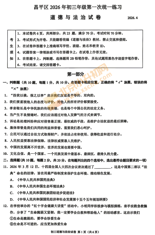 2026年昌平初三一模道德与法治试卷什么时候出?考哪些内容?满分多少?有多少题?2026、2027、2028昌平初三考生下载复习!