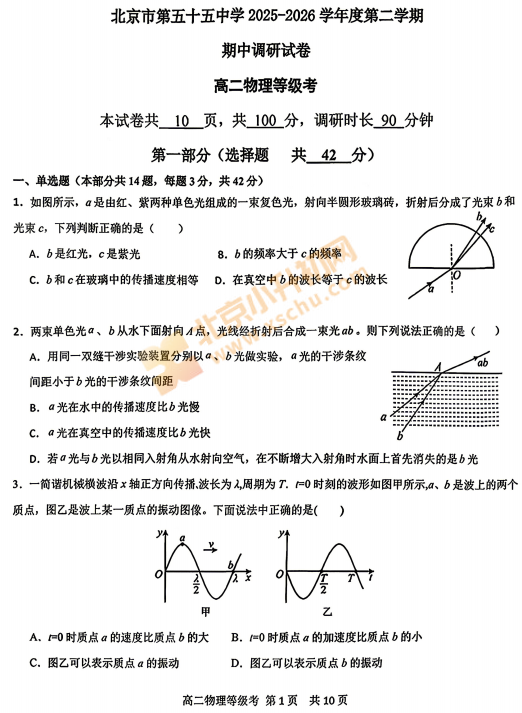 2025-2026学年(下)北京五十五中学高二期中物理试卷下载!考试分值、题型有哪些?