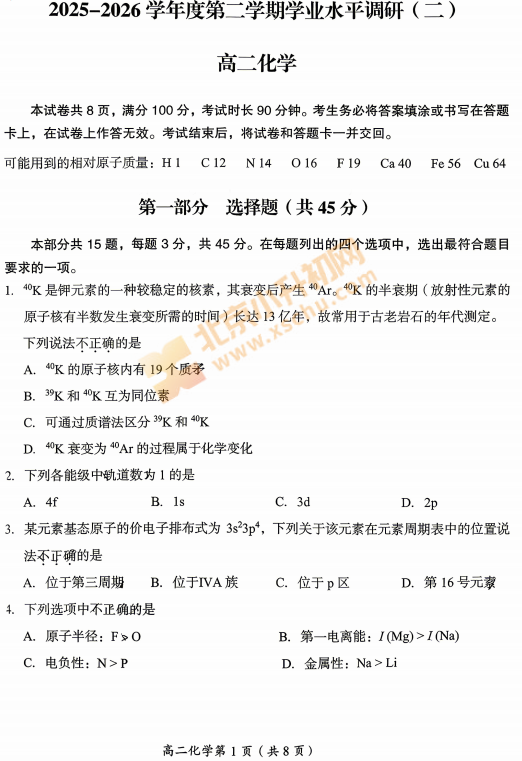 2025-2026学年(下)房山高二期中化学试卷下载!考试分值、题型有哪些?