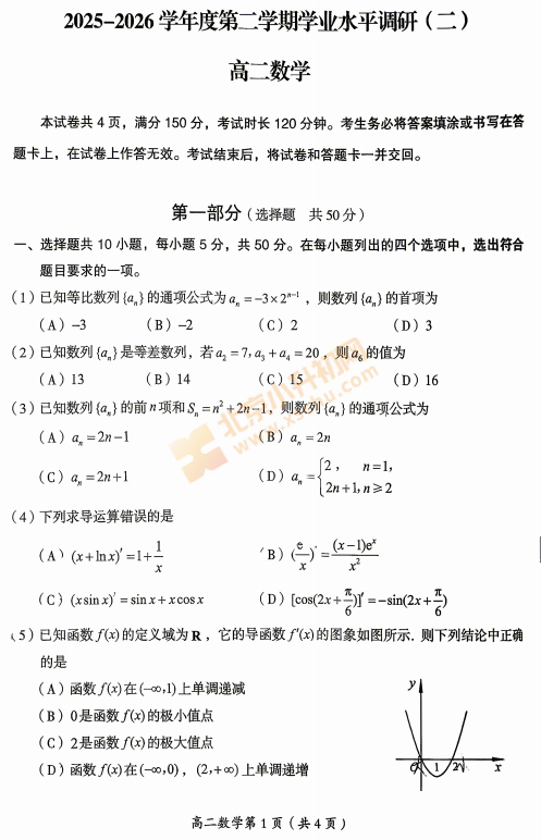 2025-2026学年第二学期房山高二期中数学试卷