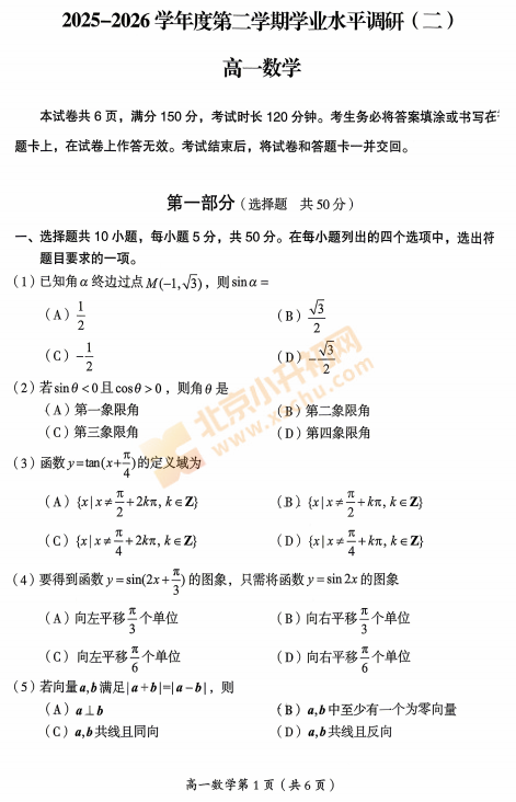 2025-2026学年(下)房山高一期中数学试卷下载!考试分值、题型有哪些?