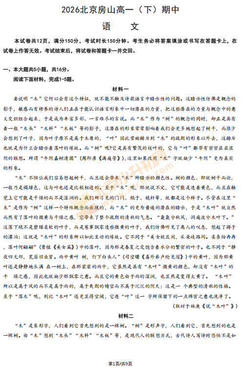 2025-2026学年(下)房山高一期中语文试卷下载!考试分值、题型有哪些?