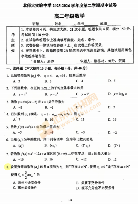 2025-2026学年(下)北师大实验中学高二期中数学试卷下载!考试分值、题型有哪些?