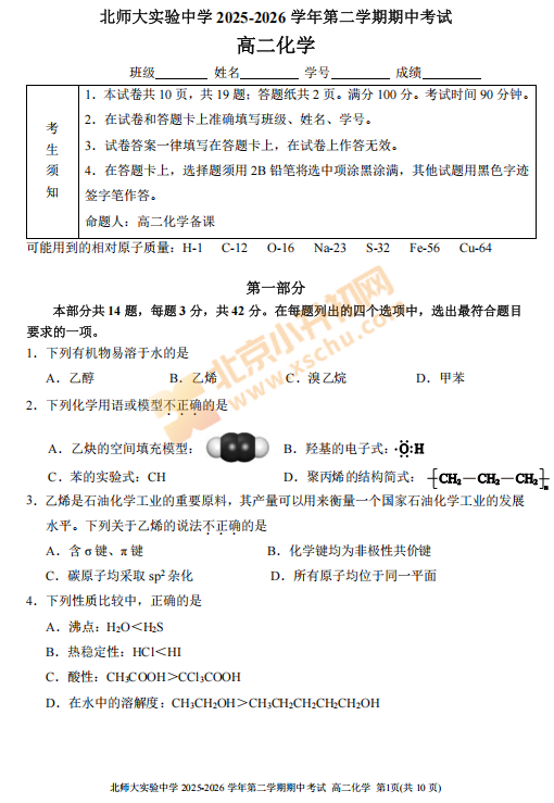 2025-2026学年(下)北师大实验中学高二期中化学试卷下载!考试分值、题型有哪些?