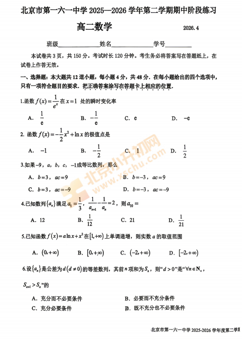 2025-2026学年(下)北京一六一中学高二期中数学试卷下载!考试分值、题型有哪些?