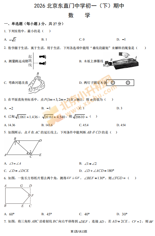 2026北京东直门中学初一(下)期中数学 有答案