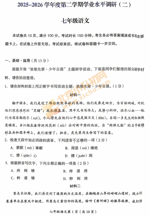 2025-2026学年(下)房山初一期中语文试卷下载!考试分值、题型有哪些?