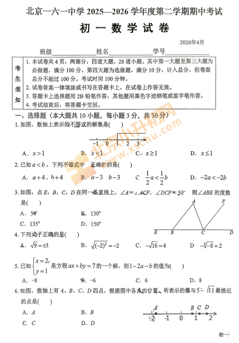 2025-2026学年(下)北京一六一中学初一期中数学试卷下载!考试分值、题型有哪些?