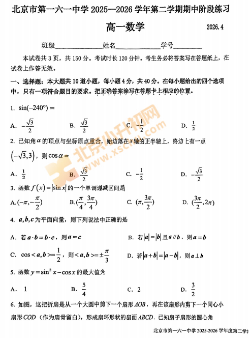 2025-2026学年(下)北京一六一中学高一期中数学试卷下载!考试分值、题型有哪些?