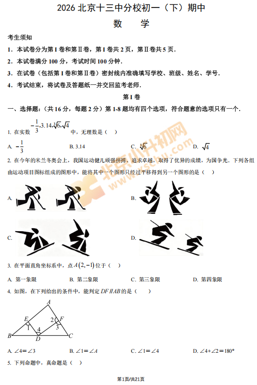 2025-2026学年(下)北京十三中分校初一期中数学试卷下载!考试分值、题型有哪些?