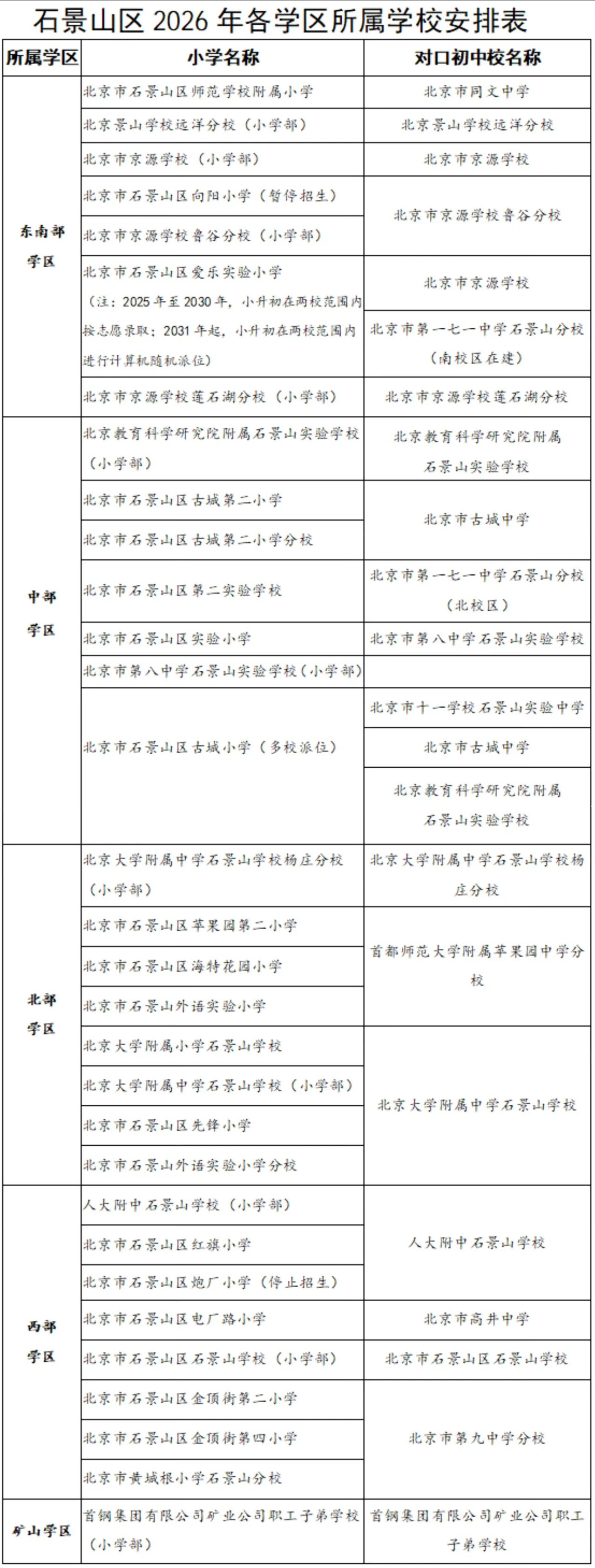 石景山区2026年各学区所属学校安排表发布!石景山2026各学区小学、对口初中有哪些?北京小升初网根据2026年石景山小升初政策整理,供2026/2027年石景山小升初家长参考!
